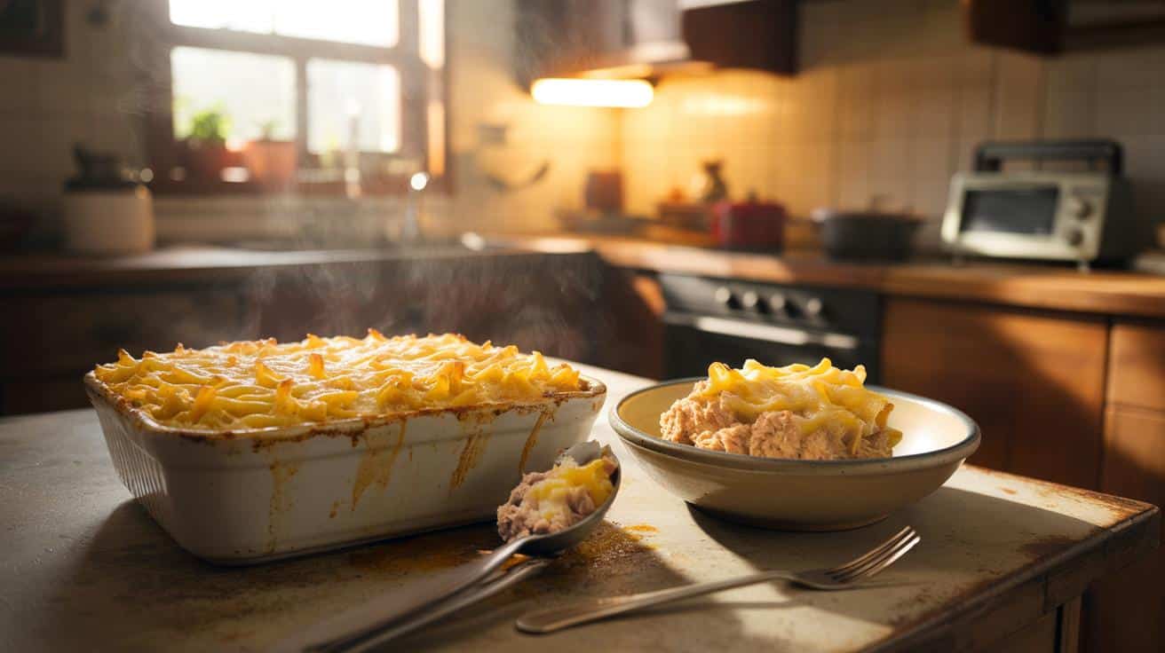The smell hit me before the oven timer did. That warm, familiar mix of baked cheese, tuna, and something creamy I couldn’t quite name dragged me straight back to a tiny kitchen with orange tiles and a radio humming in the corner. For a second, I wasn’t scrolling recipes on my phone. I was eight years old again, swinging my legs under the table, waiting impatiently for my mum to say, “Careful, it’s hot.”